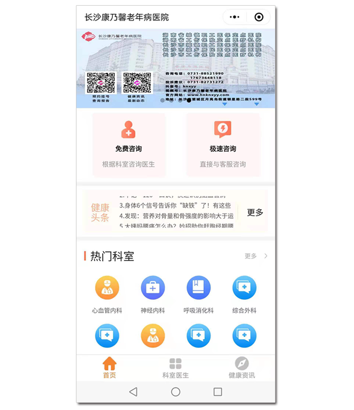 康乃馨健康服务平台(长沙康乃馨老年病医院问诊小程序),由专业全科医生团队为您提供免费就医指导,涵盖心血管内科、神经内科、呼吸消化科、综合外科、急诊科、重症医学科、肾病学科、创伤显微外科、康复科、健康体检科、肿瘤科、骨科、中医科等科室,24小时、全天候在线,为您的健康保驾护航。
