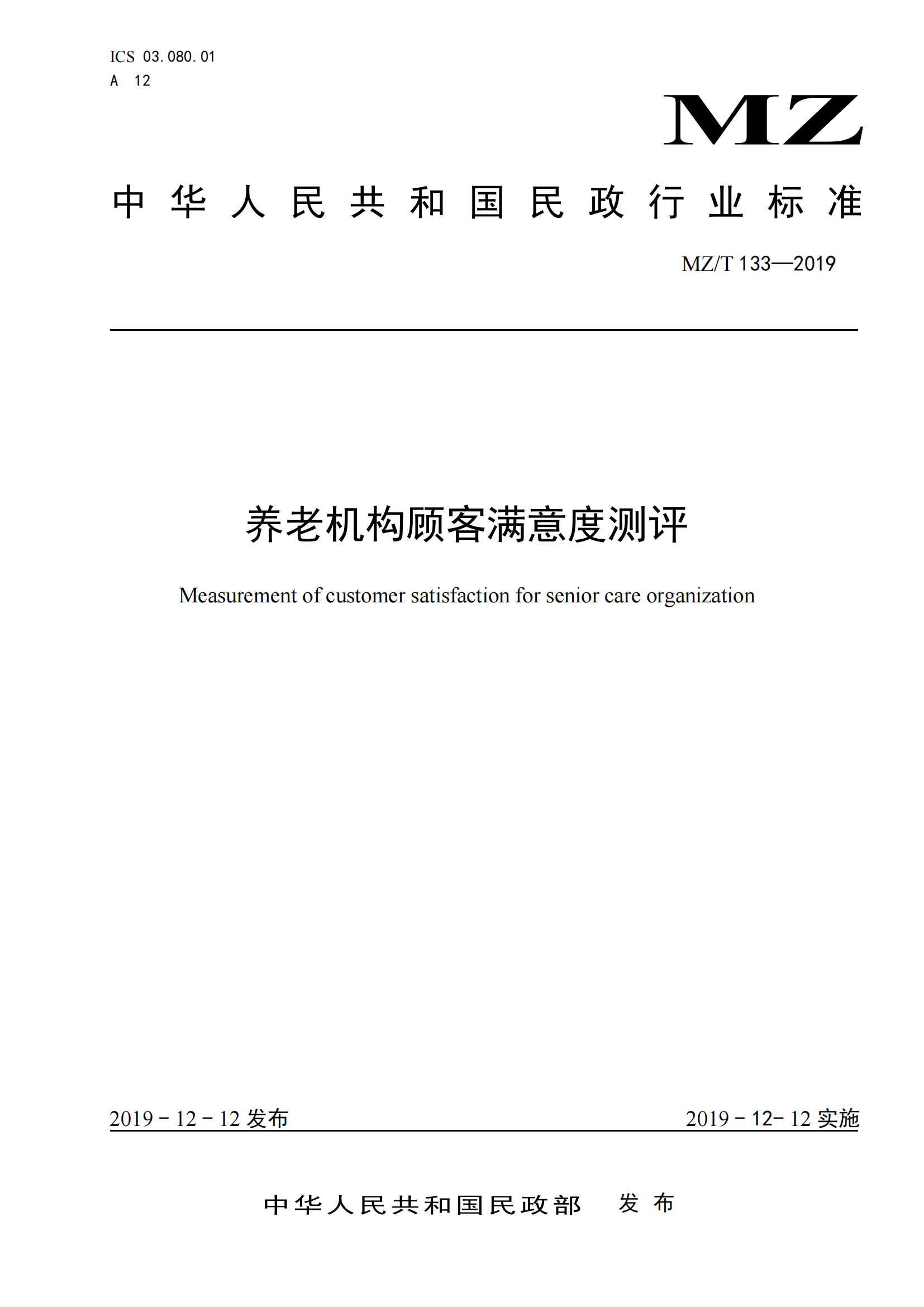 MZ/T 133-2019养老机构顾客满意度测评