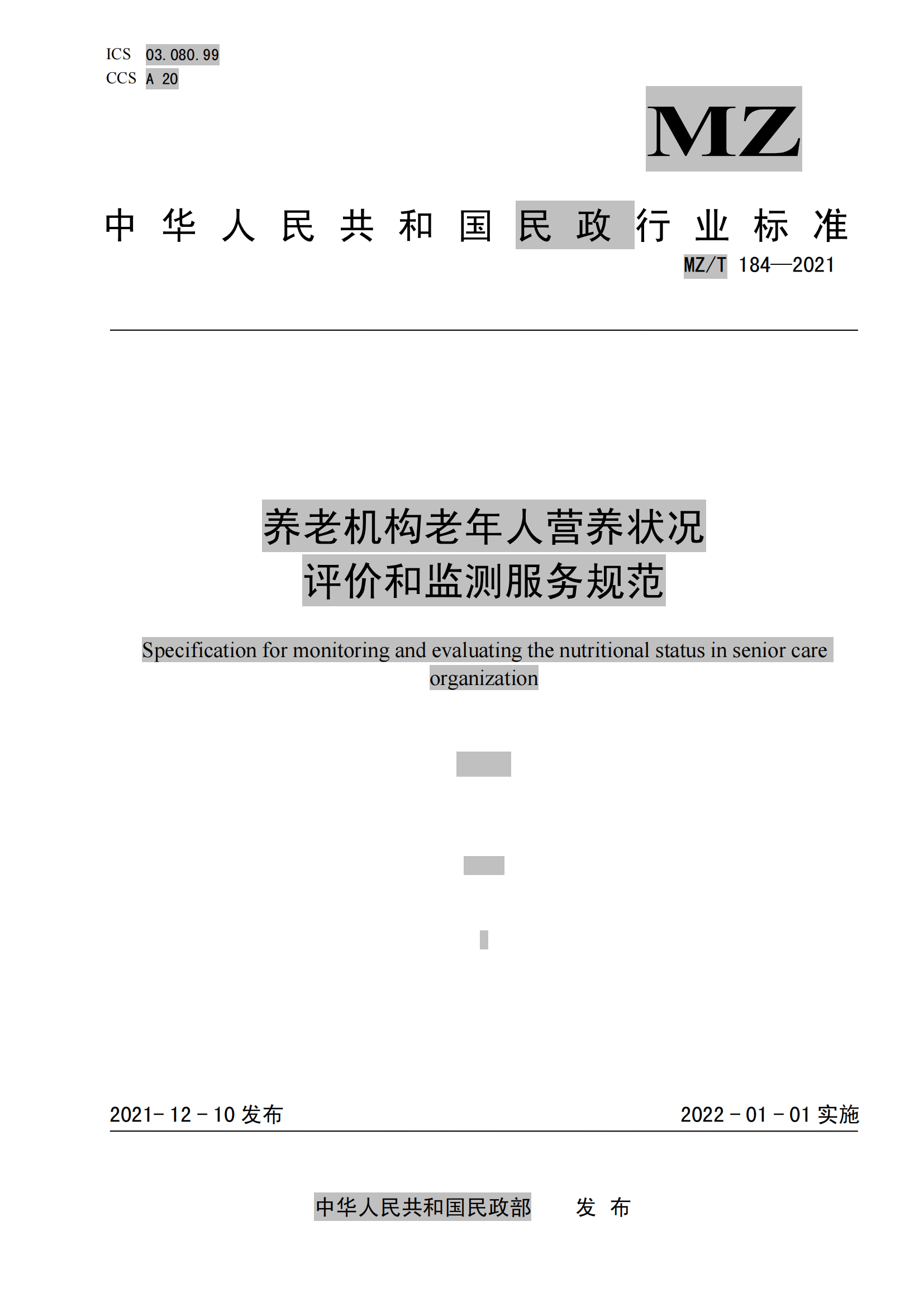 MZ/T 184-2021养老机构老年人营养状况评价和监测服务规范